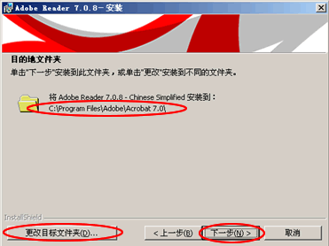 在安裝過程中,會出現(xiàn)提示文件的存放路徑,默認安裝路徑是C:\Program Files\Adobe\Acrobat 7.0 如果您想更改文件的存放位置點擊“更改目標文件夾”選項。點擊“下一步”繼續(xù)進行安裝。